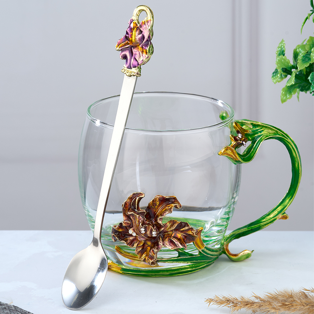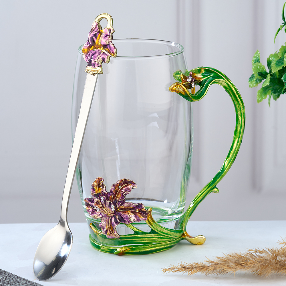 Стеклянный чайно-кофейный набор в подарочной коробке с Ирисами. Чайная чашка Ирисами с ложечкой в романтическом стиле. Кофейная кружка с ложкой в оригинальном исполнении. Стеклянная кофейная кружка, большого объёма, из стекла, подойдет для горячих и холодных напитков. Чайная чашка с ложкой выдержива..
